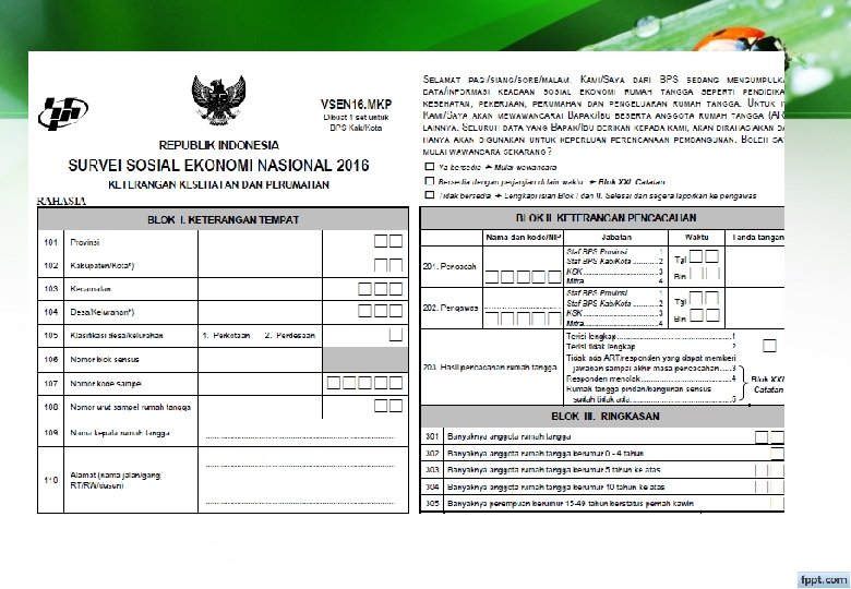 Metode Pengumpulan Data Susenas 2016 (2) § Pengumpulan data dari rumah tangga terpilih dilakukan melalui wawancara tatap muka (recalling) antara pencacah dengan responden. § Untuk pertanyaan-pertanyaan dalam kuesioner Susenas 2016 yang ditujukan kepada individu diusahakan agar individu bersangkutan yang diwawancarai. § Keterangan dalam rumah tangga dikumpulkan melalui wawancara dengan kepala rumah tangga, suami/istri kepala rumah tangga atau anggota rumah tangga lain yang mengetahui tentang karakteristik yang ditanyakan.