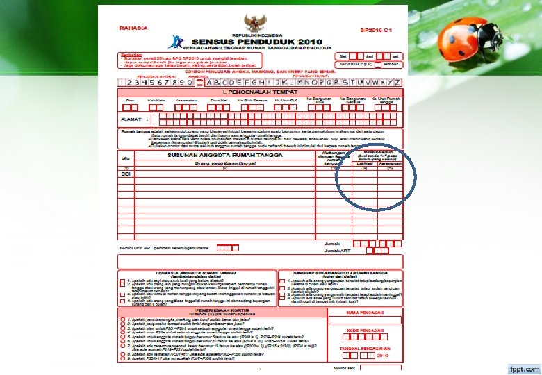 METODE PENGUMPULAN DATA (4) Sensus Penduduk di Indonesia biasa disebut pencacahan penduduk, yaitu pengumpulan data/informasi yang dilakukan terhadap seluruh penduduk yang tinggal di wilayah teritorial Indonesia. Data yang dikumpulkan antara lain: nama, umur, jenis kelamin, pendidikan, agama, kewarganegaraan, pekerjaan, dan tempat lahir. Hasilnya adalah data jumlah penduduk beserta karakteristiknya, yang sangat berguna sebagai bahan perencanaan, monitoring, dan evaluasi pembangunan. SP 2010 dapat memberikan gambaran secara aktual mengenai kondisi penduduk, perumahan, pendidikan dan ketenagakerjaan sampai wilayah administrasi terkecil.