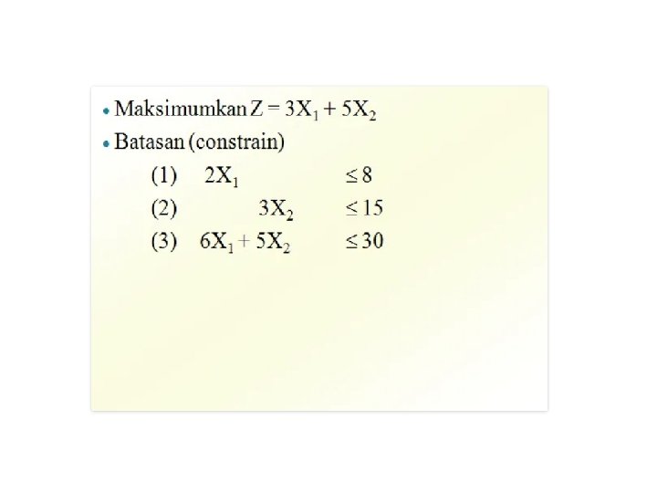 LANJUTAN…. . • Variabel slack adalah variabel yang ditambahkan ke model matematik kendala untuk mengkonversikan pertidaksamaan ≤ menjadi persamaan (=). Penambahan variabel ini terjadi pada tahap inisialisasi. Pada solusi awal, variabel slack akan berfungsi sebagai variabel basis. • Variabel surplus adalah variabel yang dikurangkan dari model matematik kendala untuk mengkonversikan pertidaksamaan ≥ menjadi persamaan (=). Penambahan ini terjadi pada tahap inisialisasi. Pada solusi awal, variabel surplus tidak dapat berfungsi sebagai variabel basis. • Variabel buatan adalah variabel yang ditambahkan ke model matematik kendala dengan bentuk ≥ atau = untuk difungsikan sebagai variabel basis awal. Penambahan variabel ini terjadi pada tahap inisialisasi. Variabel ini harus bernilai 0 pada solusi optimal, karena kenyataannya variabel ini tidak ada. Variabel hanya ada di atas kertas.