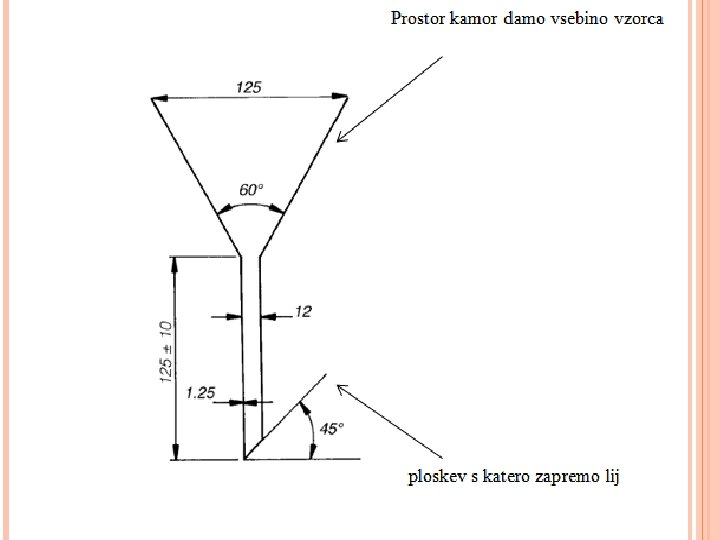 PRETOČNI ČAS Ph. Eur. : 2. 9. 16. Flowability S testom pretočnosti določimo sposobnost prahov, da tečejo vertikalno pod določenimi pogoji Za izvedbo te metode potrebujemo lij ustreznih dimenzij, ki so določene v Evropski farmakopeji.