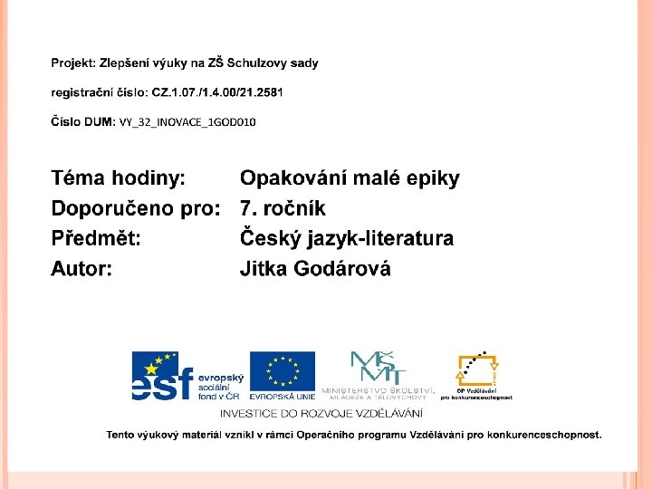 7. Charakterizuj bajku. Økrátké alegorické vyprávění ve verších nebo v próze Ønejčastěji vystupují zvířata (bajka ezopská) nebo rostliny a věci s lidskými vlastnostmi Øvýchovný charakter Øněkdy žertovný, často kritický Øpoužívání personifikace a metafor Øjeden z nejstarších literárních žánů 8. Co znamená slovo personifikace? -připisování lidských vlastností neživým věcem nebo živočichům 9. Vysvětli pojem alegorie. - jinotaj - text, který má skrytý smysl