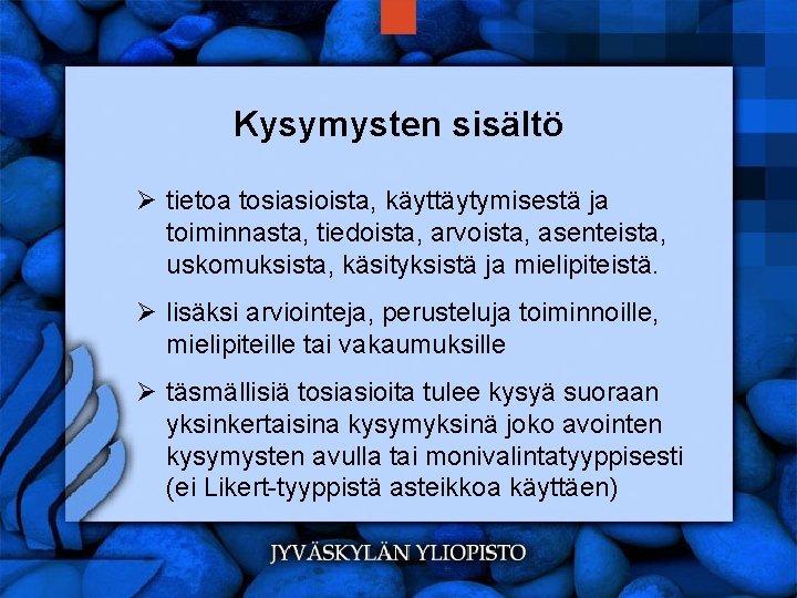 Kysymysten sisältö Ø tietoa tosiasioista, käyttäytymisestä ja toiminnasta, tiedoista, arvoista, asenteista, uskomuksista, käsityksistä ja mielipiteistä. Ø lisäksi arviointeja, perusteluja toiminnoille, mielipiteille tai vakaumuksille Ø täsmällisiä tosiasioita tulee kysyä suoraan yksinkertaisina kysymyksinä joko avointen kysymysten avulla tai monivalintatyyppisesti (ei Likert-tyyppistä asteikkoa käyttäen)