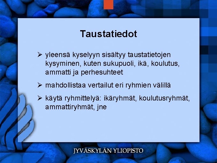 Taustatiedot Ø yleensä kyselyyn sisältyy taustatietojen kysyminen, kuten sukupuoli, ikä, koulutus, ammatti ja perhesuhteet Ø mahdollistaa vertailut eri ryhmien välillä Ø käytä ryhmittelyä: ikäryhmät, koulutusryhmät, ammattiryhmät, jne