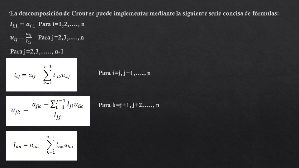 INTRODUCCION En la siguiente exposición vamos a conceptualizar, explicar y realizar ejercicios del método de Factorización o Descomposición de Crout. Este método es denominado formalmente Método de Doolittle y sirve como una alternativa al Método de Descomposición LU. Además hay un derivado del método de Crout llamado Método de Gauss-Crout.