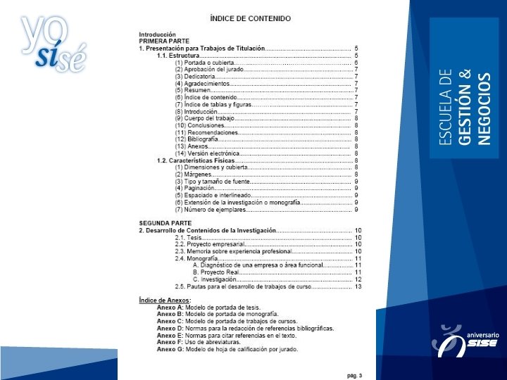 ÍNDICE • El índice menciona cada una de las partes que integran tu trabajo e indica la página en que comienza cada parte. • Se hace en página aparte. Se escribe la palabra índice y se hace una lista de las partes que tiene el trabajo. Al lado de cada parte se escribe el número de la página donde comienza esa parte.