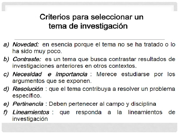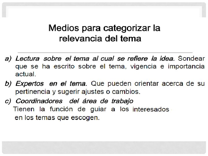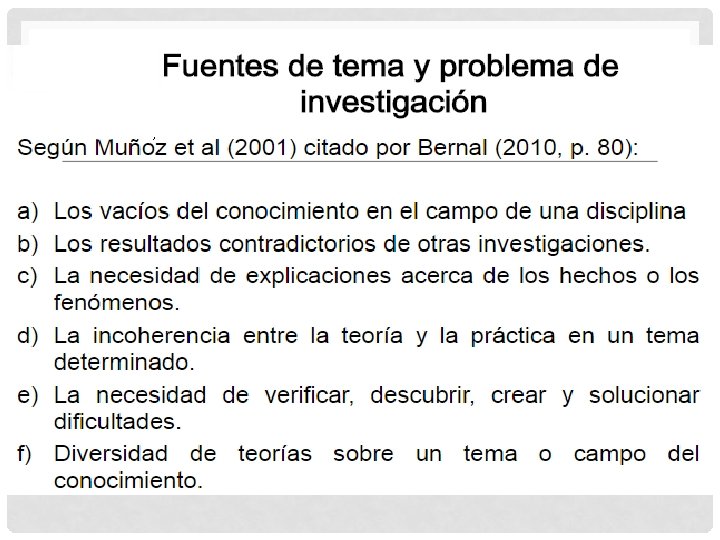 FORMAS GENERADORAS DE TEMAS DE INVESTIGACIÓN: a) Lectura reflexiva y crítica. b) Participación en conferencias, eventos académicos y demás formas de exposición y reflexión de temas. c) Experiencia individual. d) Aula de clase. e) Conversaciones coloquiales. f) Medios de comunicación, cine, videos, diarios, etc. g) Profesores y/o expertos.