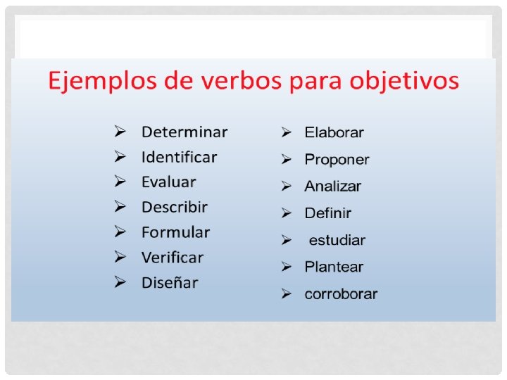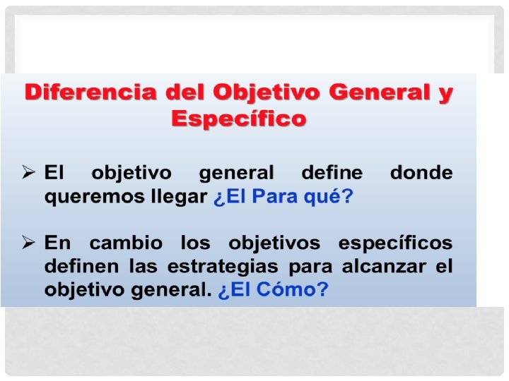 OBJETIVOS Los objetivos indican las pretensiones a detalle de lo que se quiere lograr con el trabajo de investigación, conducen todo el esfuerzo del investigador. Es importante cuidar que tengan relación con el problema, hipótesis y justificación. Se debe tomar en cuenta sus prioridades, recursos, conocimientos teóricos y empíricos. Estas características se retoman en el diseño del estudio en la metodología de la investigación. Asimismo, se deben escribir iniciando con verbos operativos y deben expresarse con claridad porque serán motivo de medición en relación al alcance que se pretende.