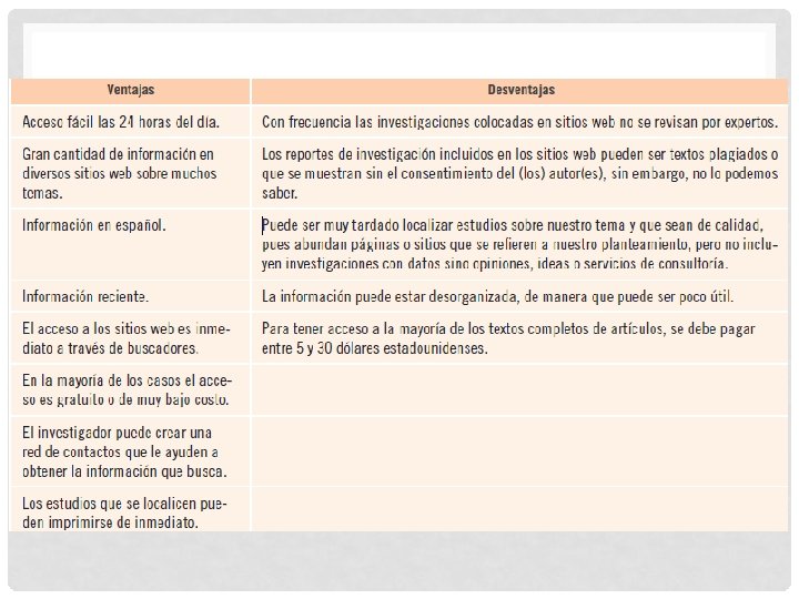 BUSQUEDA DE INFORMACIÓN Es recomendable iniciar la revisión de la literatura consultando a uno o varios expertos en el tema (algún profesor, por ejemplo) y buscando —vía internet— fuentes primarias en centros o sistemas de información y bases de referencias y datos. Para ello, necesitamos elegir las “palabras claves”, “descriptores” o “términos de búsqueda”, los cuales deben ser distintivos del problema de estudio y se extraen de la idea o tema y del planteamiento del problema. Si los términos son vagos y generales obtendremos una consulta con muchas referencias e información que no es pertinente para nuestro planteamiento. En este sentido, las bases de referencias funcionan como los “disparadores o motores de búsquedas” (Google, Yahoo, Altavista, etcétera).