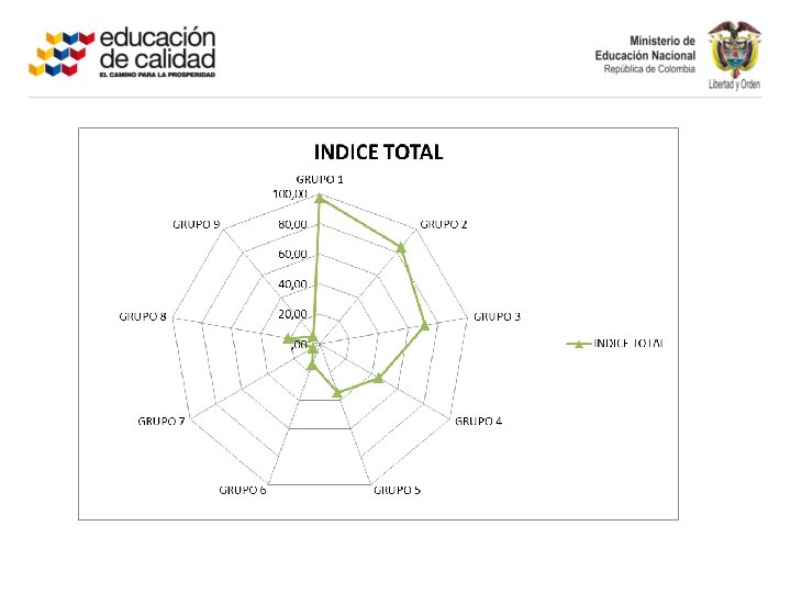 Cálculo de un índice sintético para cada dimensión • Para obtener los índices se usó el procedimiento de análisis factorial y como método de extracción el de componentes principales. • El propósito es reducir en un solo índice un conjunto de variables que evalúan condiciones similares. Cada factor recoge la mayor contribución a la suma de las varianzas de las variables originales. INDICE Varianza explicada Dimensión socioeconómica 77, 8% Vulnerabilidad 73, 0% Desarrollo educativo 78, 6% Ponderadores resultantes