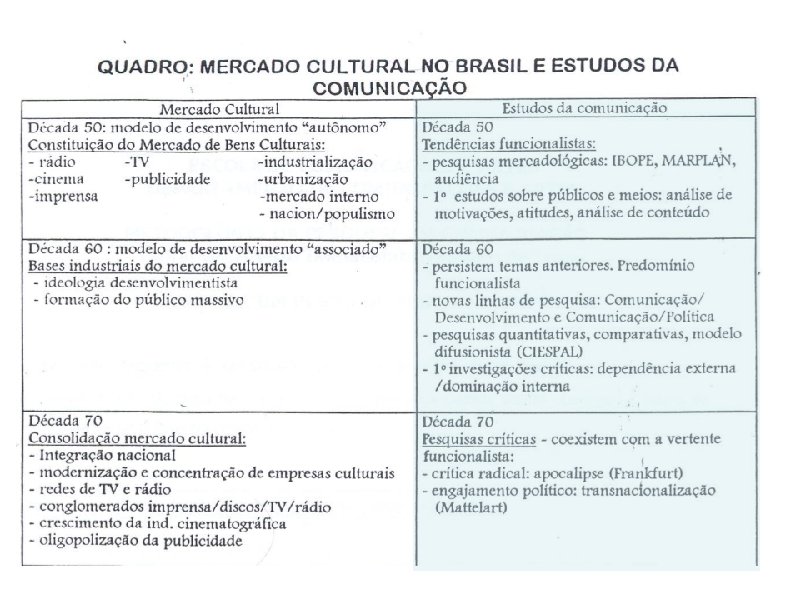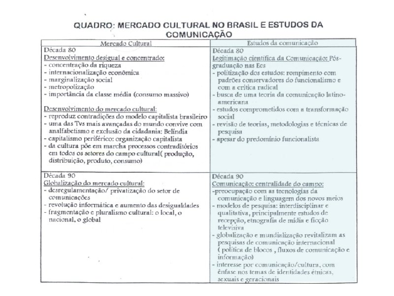 Para compreender a comunicação na contemporaneidade (globalização, pósmodernidade) Autores e conceitos E. Morin paradigma de complexidade O. Ianni paradigma da globalização I. Wallerstein transdisciplinaridade; pós-disciplinaridade A. Giddens ação reflexiva, risco Z. Bauman modernidade como ambivalência incerteza D. Harvey compressão tempo/espaço F. Jameson desigualdade M. Castells sociedade de rede G. Vattimo sociedade de comunicação generalizada S. Hall identidade cultural plural N. García Canclini culturas híbridas J. Martín-Barbero mediações, experiência mediática H. K. Bhabha cultura local / cultura global Fonte: Maria Immacolata V. Lopes