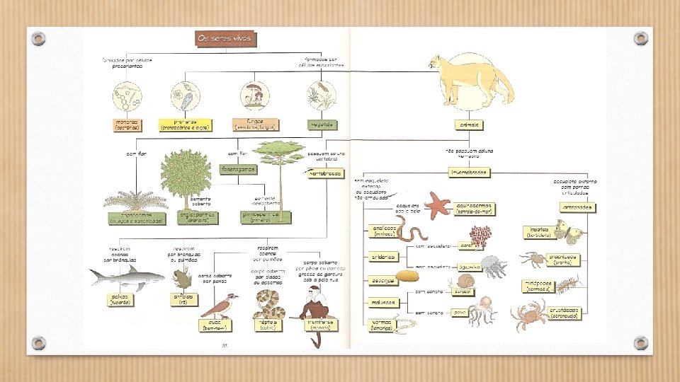 Classificando os seres vivos Para situar um ser vivo em um determinado grupo e identificar a que espécie pertence, são utilizadas “chaves de identificação”, que consistem em tabelas nas quais aparecem as características mais importantes e, ao mesmo tempo, distintivas das espécies bem como sua história evolutiva. Tais características constituem os “critérios de classificação”. O tipo de nutrição, o tipo de reprodução e o revestimento do corpo são alguns exemplos de critérios de classificação. Partindo dos trabalhos de Von Linné, atualmente os seres vivos se classificam em cinco reinos: o reino monera, o protista, o dos fungos, dos vegetais e dos animais. O critério de classificação que separa o reino monera dos demais reinos é o tipo de célula que forma o ser vivo. Se for procarionte, ou seja, sem núcleo definido, o organismo pertencerá ao reino monera, como é o caso das bactérias. Por outro lado, se o tipo de célula for eucarionte, isto é, com núcleo bem definido, então pertencerá aos demais reinos.