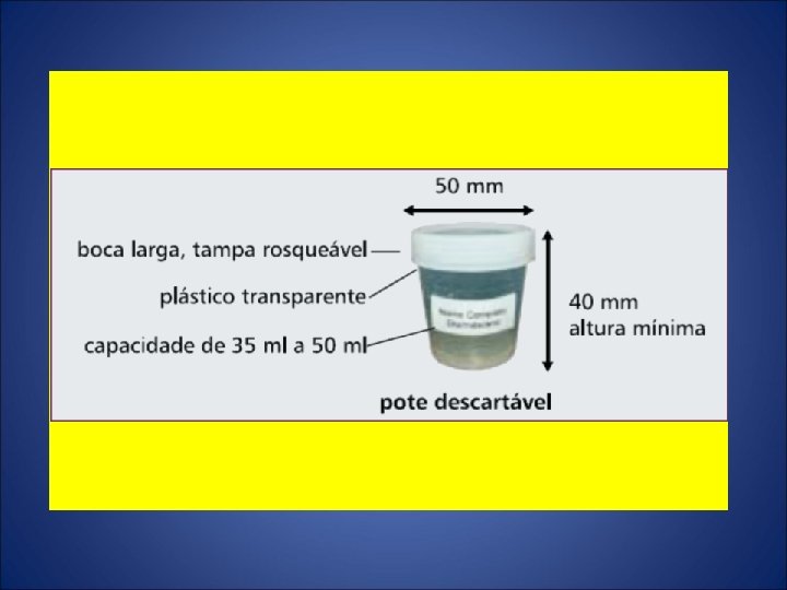 Pote para coleta: 1) pote descartável de plástico transparente com capacidade de 35 -50 ml, altura mínima de 40 mm, com boca larga e com tampa rosqueável de 50 mm de diâmetro.