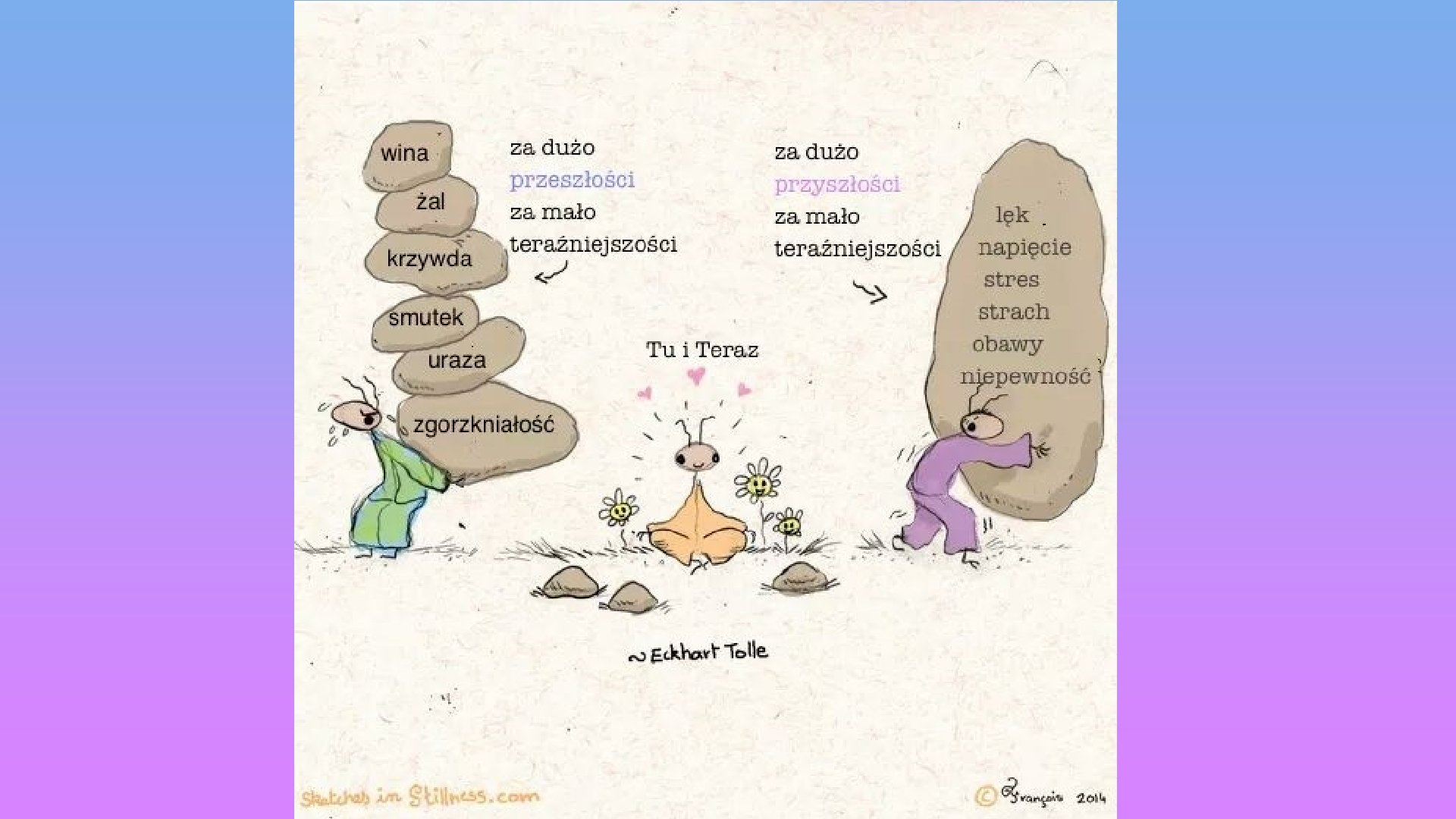Brak UWAŻNOŚCI - OBECNOŚCI Często jest tak, że ciałem jesteśmy tutaj, a myślami wędrujemy gdzie indziej: • do przeszłości - wspomnienia, żale, • do przyszłości - planowanie, zamartwianie się