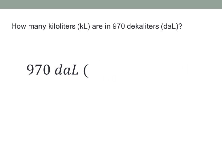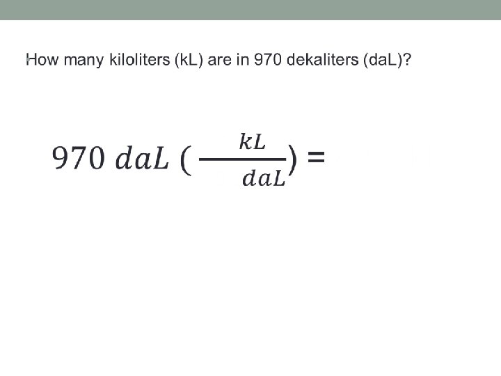Now you try a few; Convert the following measurements. Remember to show ALL work. 4. 5 kg g 190 c. L h. L 7 dam dm 86 L c. L 32 m mm 2. 6 kg mg
