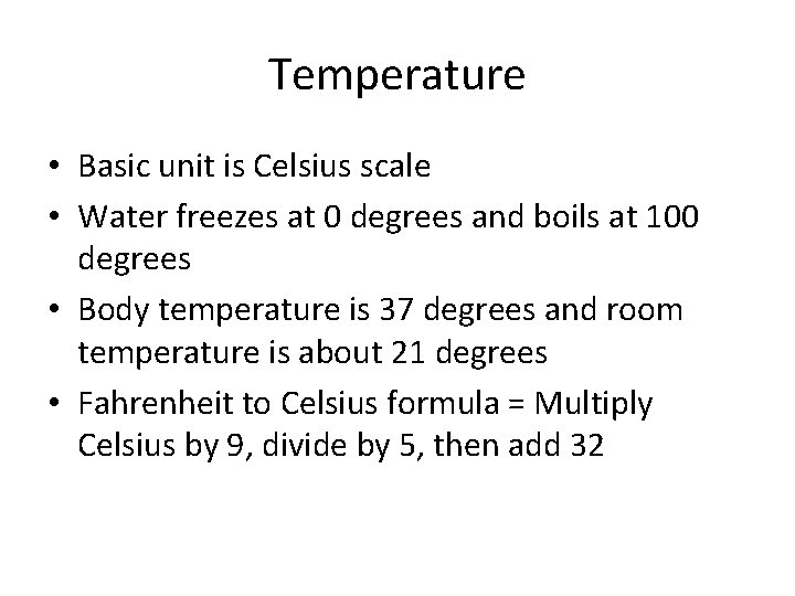 Temperature • Basic unit is Celsius scale • Water freezes at 0 degrees and boils at 100 degrees • Body temperature is 37 degrees and room temperature is about 21 degrees • Fahrenheit to Celsius formula = Multiply Celsius by 9, divide by 5, then add 32