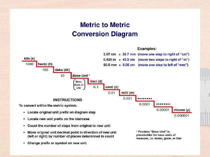 Metric Prefixes • Regardless of the unit, the entire metric system uses the same prefixes. – Kilo = 1000 – Hecto = 100 – Deka = 10 – Meter/liter/gram = 1 – Deci = 1/10 th – Centi = 1/100 th – Milli = 1/1000 th