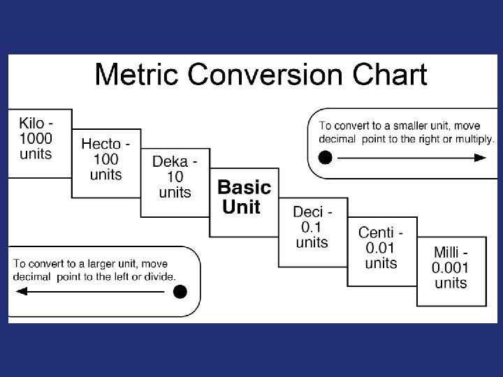 smaller units • 1/10 of meter = decimeter (dm) • 1/100 of meter = centimeter (cm) • 1/1000 of meter = millimeter (mm) larger units • 10 meters = dekameter (dam) • 100 meters = hectometer (hm) • 1000 meters = kilometer (km)