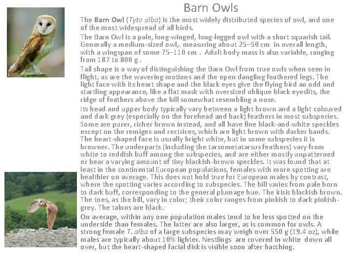 Barn Owls The Barn Owl (Tyto alba) is the most widely distributed species of owl, and one of the most widespread of all birds. The Barn Owl is a pale, long-winged, long-legged owl with a short squarish tail. Generally a medium-sized owl, . measuring about 25– 50 cm in overall length, with a wingspan of some 75– 110 cm. Adult body mass is also variable, ranging from 187 to 800 g. Tail shape is a way of distinguishing the Barn Owl from true owls when seen in flight, as are the wavering motions and the open dangling feathered legs. The light face with its heart shape and the black eyes give the flying bird an odd and startling appearance, like a flat mask with oversized oblique black eyeslits, the ridge of feathers above the bill somewhat resembling a nose. Its head and upper body typically vary between a light brown and a light coloured and dark grey (especially on the forehead and back) feathers in most subspecies. Some are purer, richer brown instead, and all have fine black-and-white speckles except on the remiges and rectrices, which are light brown with darker bands. The heart-shaped face is usually bright white, but in some subspecies it is browner. The underparts (including the tarsometatarsus feathers) vary from white to reddish buff among the subspecies, and are either mostly unpatterned or bear a varying amount of tiny blackish-brown speckles. It was found that at least in the continental European populations, females with more spotting are healthier on average. This does not hold true for European males by contrast, where the spotting varies according to subspecies. The bill varies from pale horn to dark buff, corresponding to the general plumage hue. The irisis blackish brown. The toes, as the bill, vary in color; their color ranges from pinkish to dark pinkishgrey. The talons are black. . On average, within any one population males tend to be less spotted on the underside than females. The latter are also larger, as is common for owls. A strong female T. alba of a large subspecies may weigh over 550 g (19. 4 oz), while males are typically about 10% lighter. Nestlings are covered in white down all over, but the heart-shaped facial disk is visible soon after hatching.