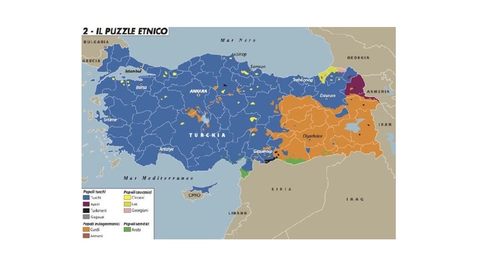 Popoli e religioni dell’Impero turco-ottomano Censimento metà Ottocento (fonte: Lettere sulla Turchia o quadro statistico dell’Impero ottomano, a cura di A. Ubicini, Milano 1853) Religione Gruppi etnici Musulmani Presenti Europa in Presenti in Asia minore Presenti in Africa Totale Turchi ottomani, 4. 450. 000 Albanesi, Bosniaci, Curdi, Turcomanni, Arabi 12. 650. 000 3. 800. 000 21. 000 Cristiani ortodossi Greci, Armeni 10. 000 3. 000 13. 000 Cattolici Siriani di Aleppo, Bulgari, Croati, Greci Malkiti, Armeni uniti, Caldei, Maroniti 640. 000 260. 000 900. 000 Altri Zingari, Chemsiyè Yezidi 50. 000