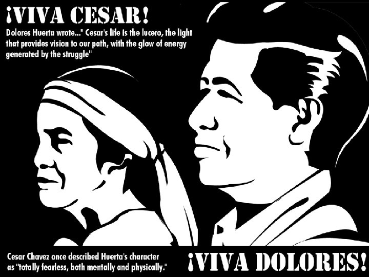 Dolores Huerta (1930 • Worked to improve social and economic conditions of immigrant workers and fought to end discrimination • Created the Agricultural Workers Association and co-founded the United Farm Workers • Lobbied politicians on many issues – Allowing migrant workers w/out U. S. Citizenship to receive public assistance and pensions and creating Spanish-language voting ballots and driver tests • Received the Ellis Island Medal of Freedom Award and the Eleanor Roosevelt Award • Also was inducted into the National Women’s Hall of Fame • Quote: “Walk the street with us into history. Get off the sidewalk”