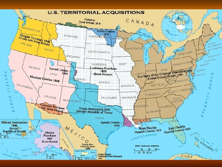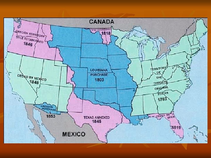 Acquisition of Territory n n n n n 1763 – French and Indian War 1783 – Revolutionary War (Treaty of Paris) 1803 – Louisiana Purchase 1812 – Concrete Northeast Border (Treaty of Ghent) 1818 – Treaty of 1818, 49 th Parallel to “Stony Mtns”) 1819/21 – Adams-Onis Treaty 1845 – Texas as 38 th state 1846 – Oregon Treaty 1848 – Mexican Cession 1853 – Gadsden Purchase