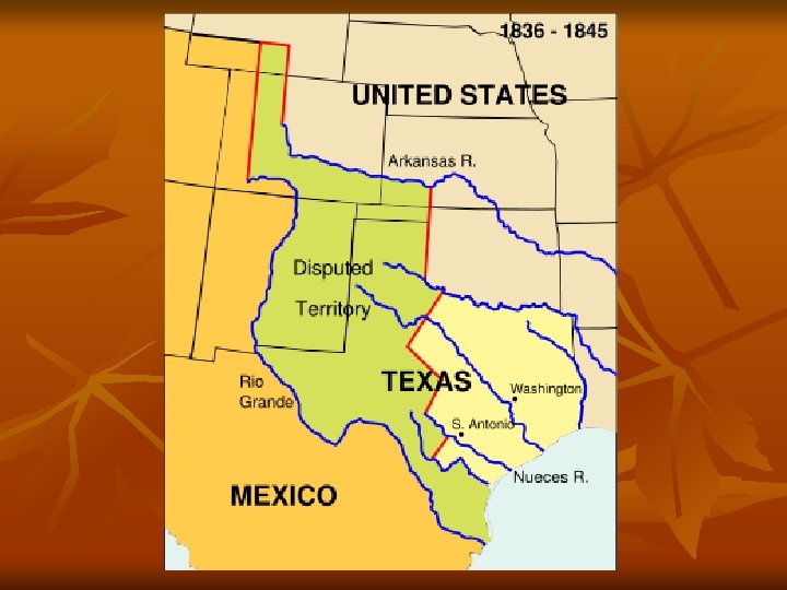 War with Mexico n Began over dispute of southern boundary of Texas n n n U. S. claimed Rio Grande as southern border Mexico claimed Nueces River as border Polk wanted more than just Texas n n Elected on platform of Manifest Destiny Wanted to acquire entire western Mexican territory