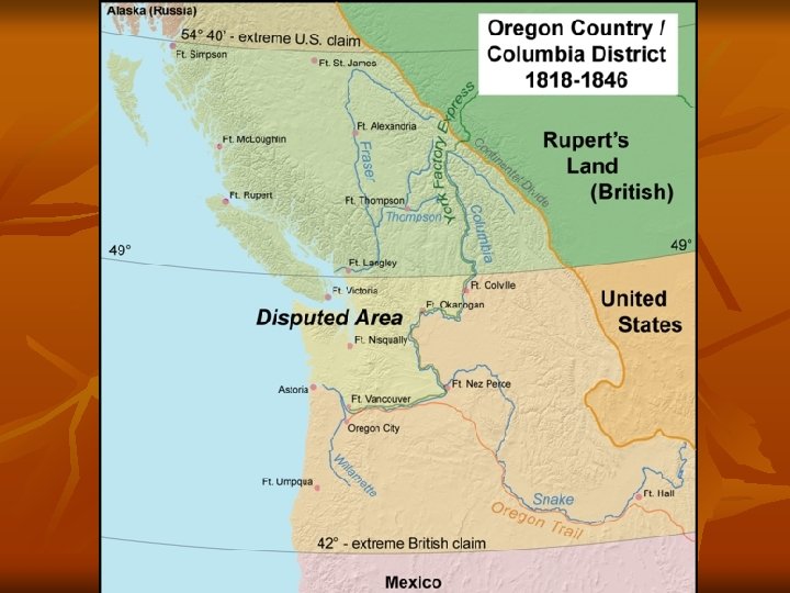 Treaties with British • Treaty of 1818 – • Established “Joint-Occupancy” of Oregon Territory between British and U. S. Treaty of 1846 (“Oregon Treaty”) – – British ceded territory south of 49 th Parallel to U. S. British moved from Fort Vancouver to Fort Victoria