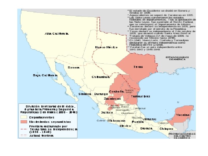 1821 Mexican independence 1830 s Anglo American presence The Texas Revolt: (1820 -1830 s) • • Mexican government: freed enslaved people and placed restrictions on U. S. immigration, Texas rebellion • • U. S. settlers go beyond an existing boundary and intentionally aim to create new territory (Texas portion of Mexican state Coahuila y Tejas) 1836 Republic of Texas; 1845 joins US 1848 Mexico surrenders ($15 million) Treaty of Guadalupe Hidalgo