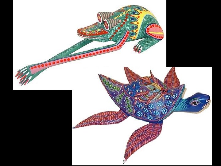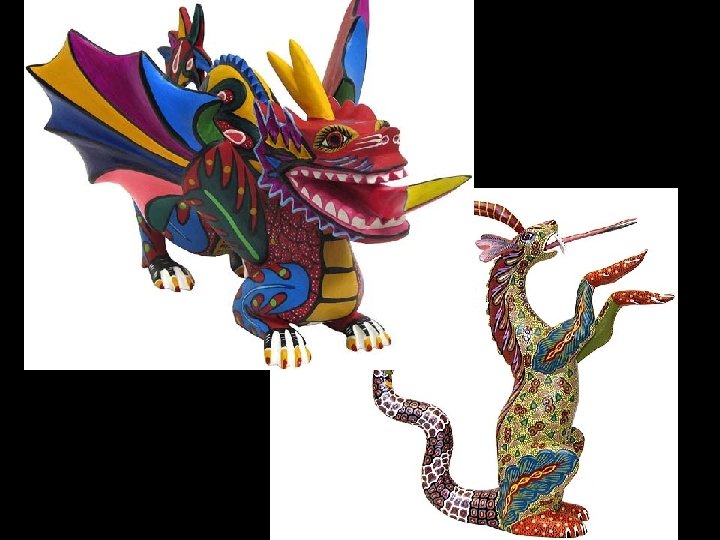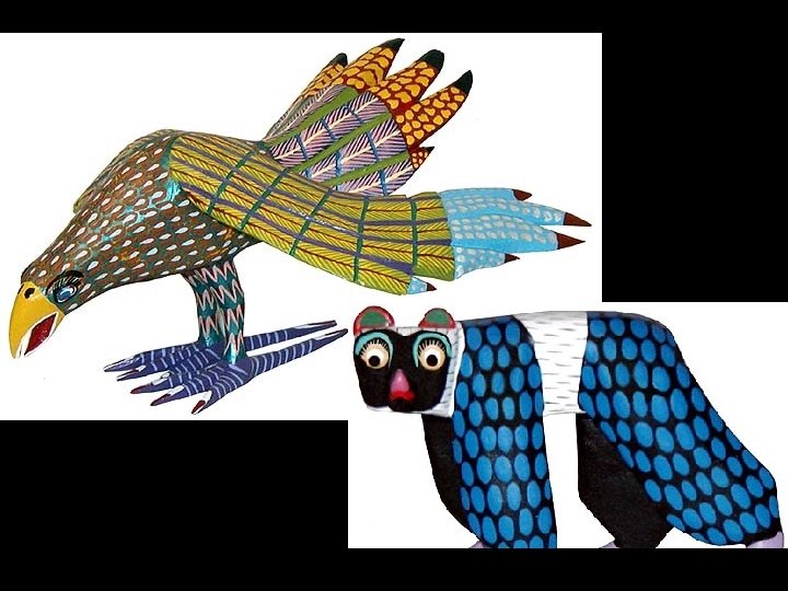 OAXACAN WOOD CARVINGS Each figure is carved by hand from the wood of the copal tree. Afterwards, the figures are painted with brilliant acrylic colors.