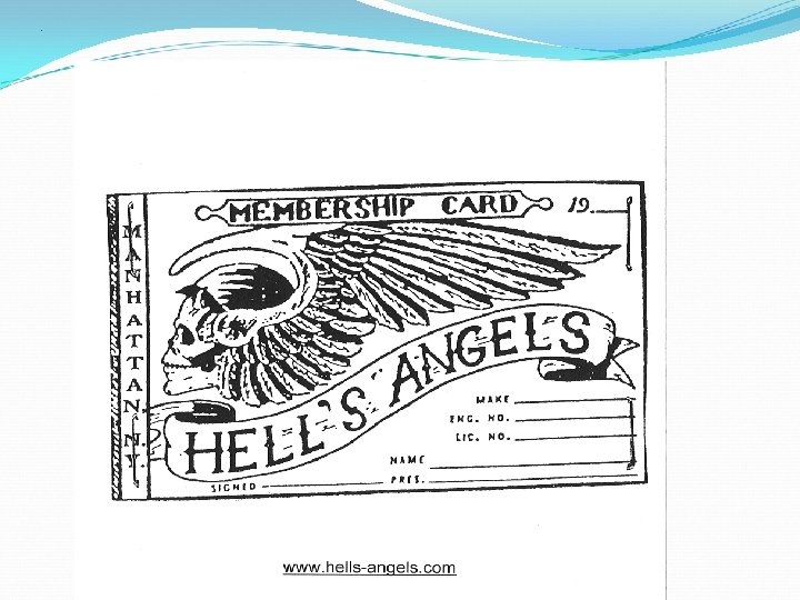 American Motorcycle Gangs Hell’s Angels - some members of the POBOB and the Market Street Commandos broke away from their respective motorcycle gangs and formed Hell’s Angels around 1950 - remained a Southern California entity for years, but began to expand in the late 1950 s - now a worldwide organization, with 467 chapters in some 59 countries; 35 chapters in the U. S. - membership figures are hard to estimate; likely just under 1, 000 sworn/active members, but as many as 50, 000 associates in the U. S. ; international numbers are unknown - heavily in meth and money laundering - a multi-billion dollar syndicate with profits from illegal activities going into the legitimate markets - many chapters organized as a church to avoid paying taxes