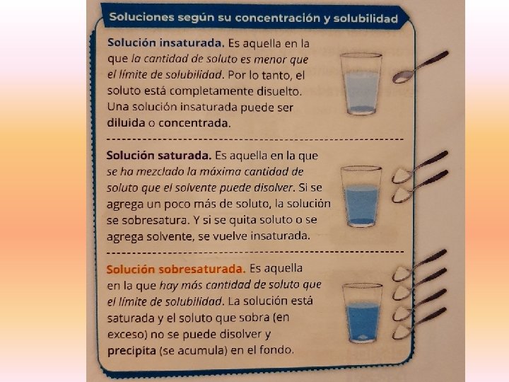 A su vez, no es lo mismo colocar una cucharada de sal en un vaso de agua que colocar muchas cucharadas, esto se debe a que para cada soluto hay una cantidad máxima que puede disolverse en una determinada cantidad de solvente, ya que si hay mucho soluto para una cantidad de solvente, una parte de ese soluto no va a disolverse completamente.