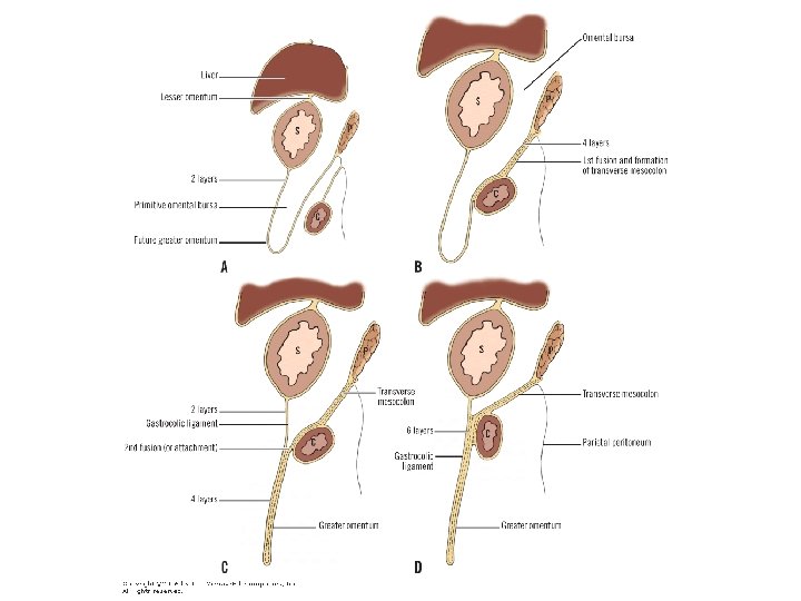 Ön mezenter • Erişkinde falsiform, karaciğer triangular bağ, gastrohepatik ve gastroduodenal bağ olarak bulunur.
