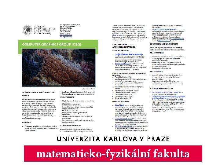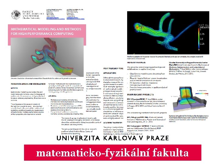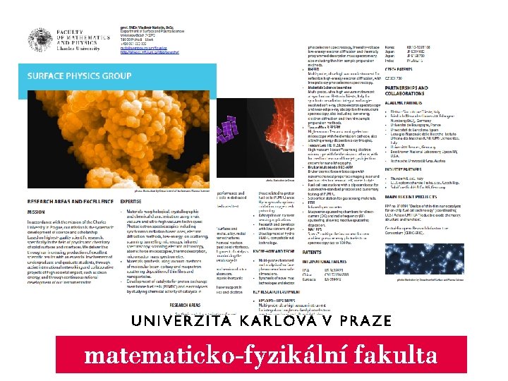 Další vizitky: Matematické pravděpodobnost a statistika Multidisciplinární výzkumné centrum moderních materiálů Laboratoř magnetismu a nízkých teplot Katedra fyziky atmosféry: nabídka expertní studie s ohledem na klimatické modelování, problematiku kvality ovzduší anebo modelování proudění a rozptyl znečištění. Jediné univerzitní pracoviště zaměřené na meteorologii a atmosféru v ČR. Konsorcium SW 3 D Zabývá se vývojem teoreticky pokročilých metod seismické prospekce pro ropný průmysl. Na jedné straně složitá matematická teorie seismických vln, na druhé straně firmy jako British Petrol, Total nebo Schlumberger, které mohou s použitím nové metodiky levněji těžit ropu. Eko to není Analýza seismického hazardu a vývoj systému včasného varování. Vývoj systému včasného varování např. v Itálii nebo v Jordánsku (jaderná elektrárna). V současnosti se stejnou věcí zabývá pro úložiště jaderného odpadu v ČR.