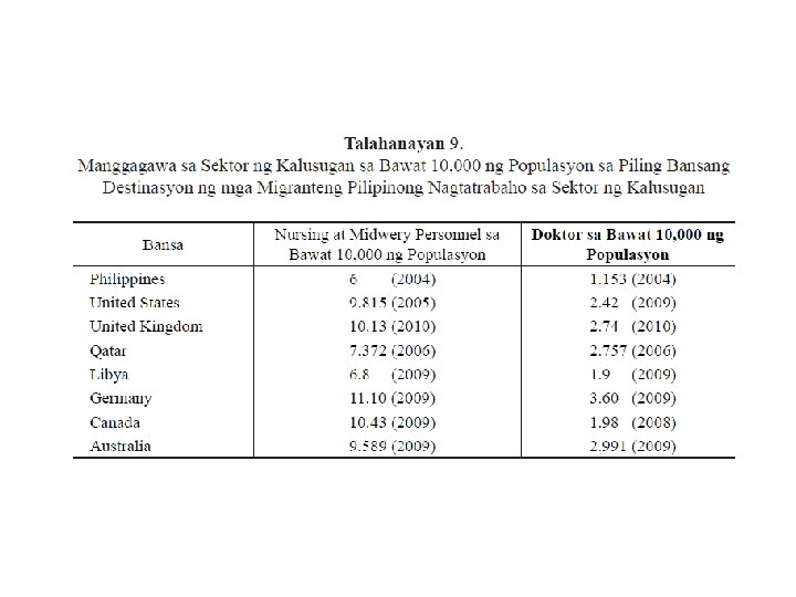 Mga Mungkahing Pamagat • Kalitatibo at Kantitatibong Pagsusuri sa Kontribusyon ng Mga Pilipino sa GDP ng Singapore, Japan at South Korea • Pagsusuri sa Potensyal na Epekto ng ASEAN Integration sa Liberalisasyon ng Piling Propesyon (Guro, Inhinyero at Nars) • Mga Di-Ekonomikong Epekto sa Manggagawa ng Inseguridad na Dulot ng Kontraktwalisasyon