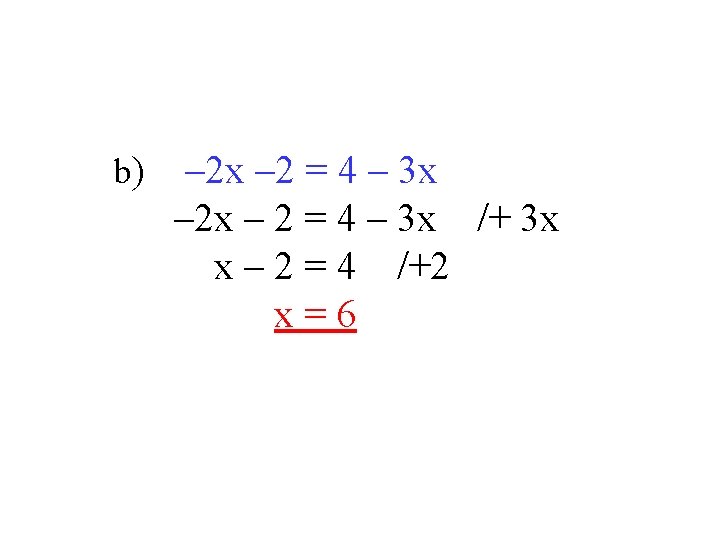 Rieš rovnice a vykonaj skúšku správnosti a) 15 x + 1 = 8 x – 13 /– 1 15 x = 8 x – 14 /– 8 x 7 x = – 14 /: 7 x = – 2