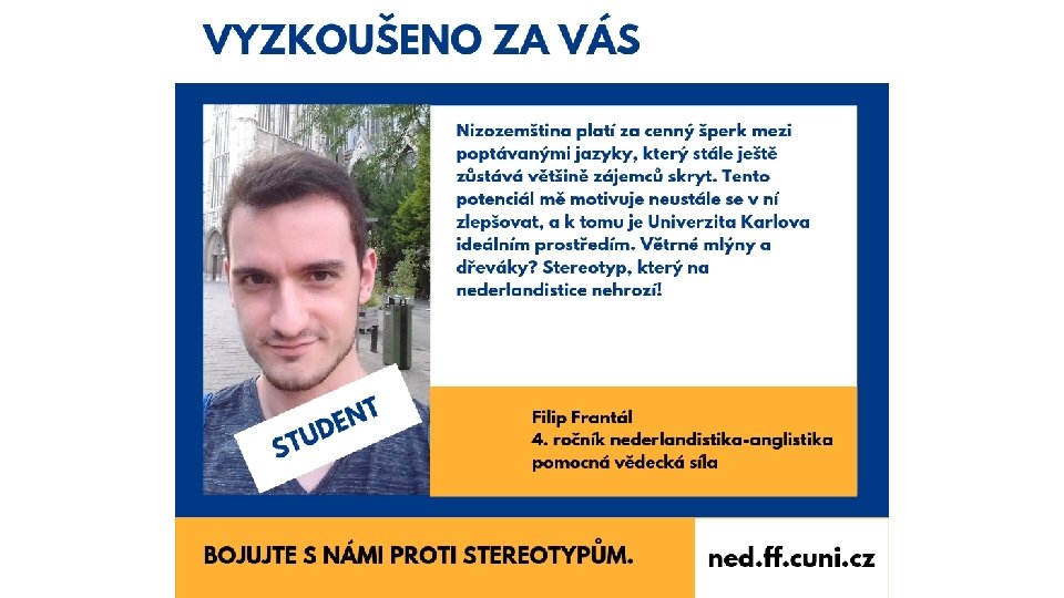 Informace a kontakty § Web: www. ned. ff. cuni. cz § FB: Nederlandistika FF UK / Neerlandistiek Praag https: //www. facebook. com/nederlandistika. praha/ § Instagram: ned_ff_uk https: //www. instagram. com/ned_ff_uk/ § lucie. sedlackova@ff. cuni. cz (Vedoucí oddělení nederlandistiky) § waffleffuk@gmail. com (Studentský spolek WAFFLE)