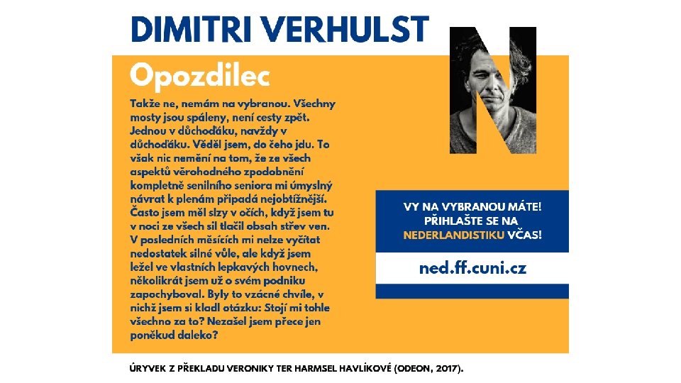 Co můžete dělat – během studia § Povídat si se špičkovými nizozemskými a vlámskými vyučujícími hostujícími v Praze § Získat mezinárodní certifikát Certificaat Nederlands als Vreemde Taal (CNa. VT) § Vyjet na Erasmus do Amsterdamu, Bruselu, Gentu, Leidenu nebo Utrechtu § Zapojit se do studentských projektů § Zúčastnit se intenzivního jazykového kurzu (Taalunie, Comenius) § Přispívat na studentský blog (Praagselijntjes) PŘELOŽENO STUDENTY NEDERLANDISTIKY § Účastnit se překladatelských soutěží nebo je vyhrávat