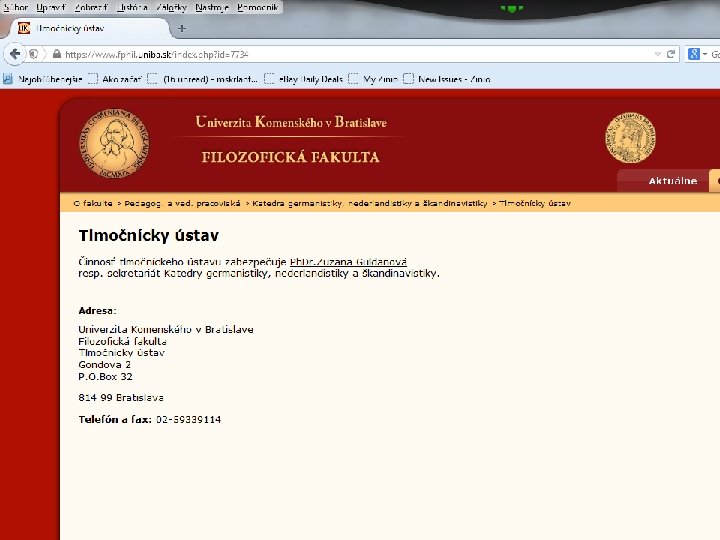 Ďalšie aktivity tlmočníckeho ústavu Fi. F UK Projekt TRANSIUS Od konvencií k normám prekladu v právnom diskurze október 2013 – september 2017 www. fphil. uniba. sk/transius Financovanie: APVV Hlavný riešiteľ Univerzita Komenského Bratislava Filozofická fakulta Spoluriešiteľ Univerzita Mateja Bela BB Fakulta humanitných vied