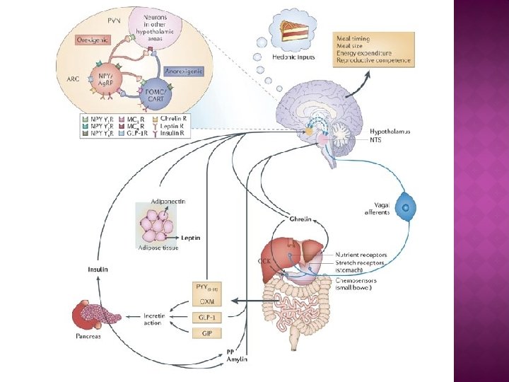 špatné složení stravy nebo hyperfagie � endogenní systém �genetické predispozice – Ob, Tub, Fat, Db geny �neuroendokrinní regulace hypothalamus – arcuate nucleus �orexigenní neurony – NPY, Ag. RP �anorexigenní neurony – POMC a CART proteiny monoaminy – NE, D, 5 -HT nucleus tractus solitarii leptin - ↓ chuť k jídlu CCK, amylin, inzulin, glukagon, PYY 3 -36, GLP-1, oxyntomodulin - ↓ chuť k jídlu ghrelin - ↑ chuť k jídlu �