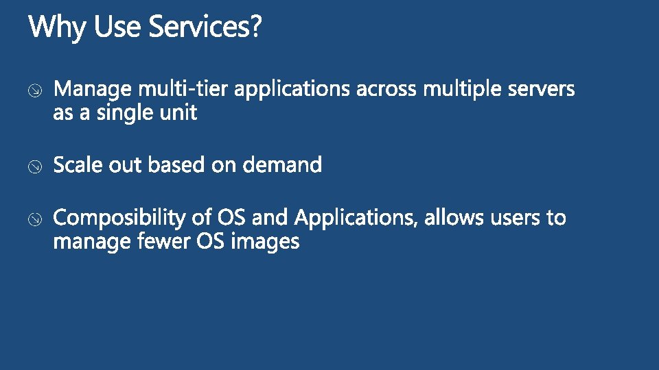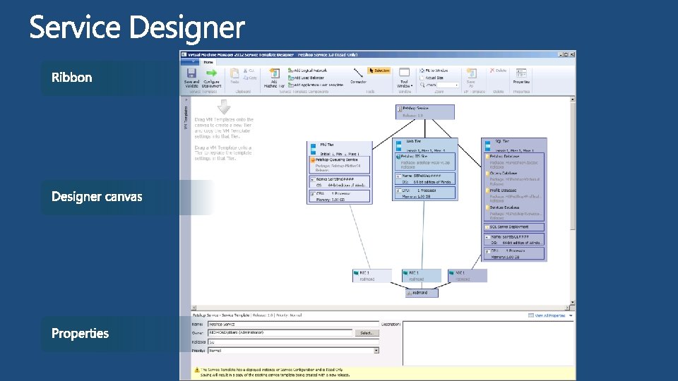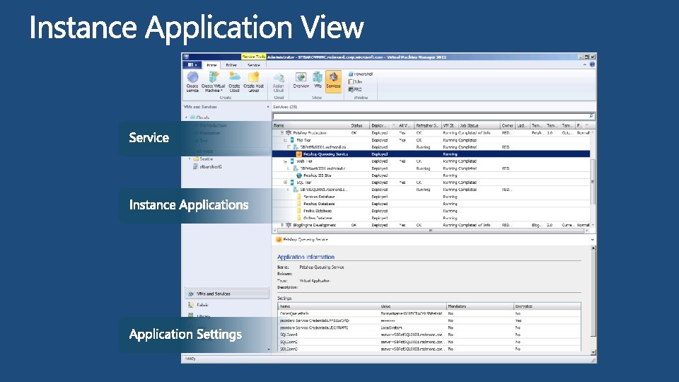 Template Starting point for services and source of truth Specifies machine and connectivity requirements Deployed services are always linked to their templates Enables servicing of the instances Instance Groups of machines that work together Includes machine definitions as well as applications Native application types: Web Applications (Web. Deploy) (2. 0 and 3. 0) Virtual Applications (Server App-V) (RTM and SP 1) Database Applications (SQL DAC) (v 1. 1 and v 3)