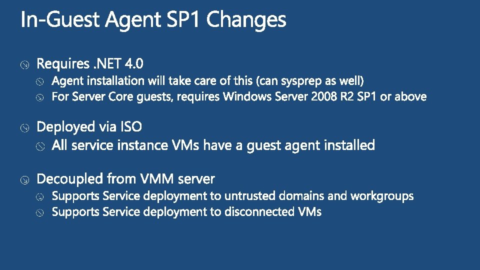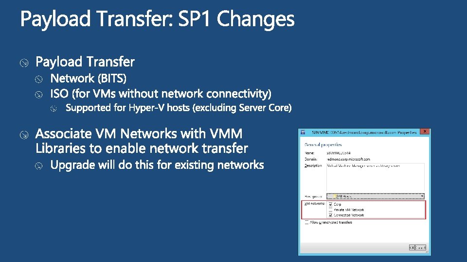 Deployment Fabric Cloud Services Infrastructure Enhancements Fabric Management Cloud Management Service Management HA VMM Server Hyper-V Bare Metal Provisioning Hyper-V, Upgrade VMware, Citrix Xen. Server Update Management Dynamic Optimization Custom properties Network Management Powershell Storage Management Monitoring Integration Application Owner Usage Capacity and Capability Delegation and Quota Service Templates Application Deployment Custom Command Execution Image Based Servicing