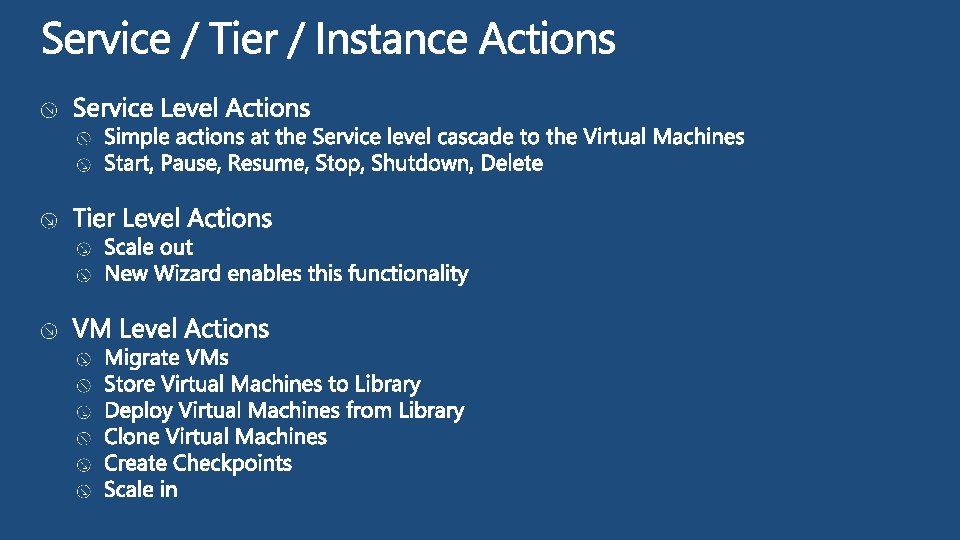 Per Service Select Tier Based on Deployment Order Per Machine Per Guest OS Per Application Create Template Update Service Create New VM from Template Customize Deployment Deploy Service Power On and Wait for VM Install VMM guest agent Install Application Done Add to Load Balancer Built-In Step