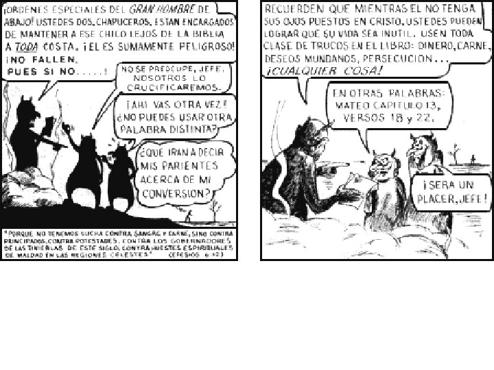 n "Vestíos de toda la armadura de Dios, para que podáis estar firmes contra las asechanzas del diablo. Porque no tenemos lucha contra sangre y carne, sino contra principados, contra potestades, contra los gobernadores de las tinieblas de este siglo, contra huestes espirituales de maldad en las regiones celestes. Por tanto, tomad toda la armadura de Dios, para que podáis resistir en el día malo, y habiendo acabado todo, estar firmes. " (Efesios 6. 11 -13, RVR 60)