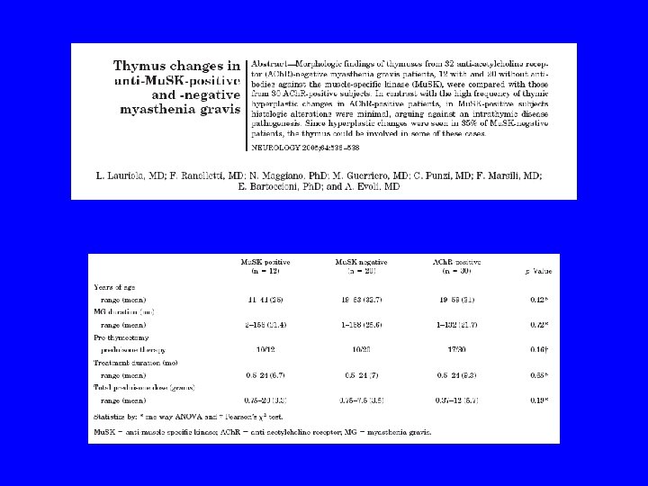 Miastenia seronegatywna • surowice 60 -70% pacjentów z „seronegatywną” MG: przeciwciała anty-Mu. SK (Hoch 2001) • Mu. SK (muscle specific tyrosine kinase) udział w tworzeniu skupisk ACh. R w błonie postsynaptycznej • miastenia Mu. SK-pozytywna 0 -40% populacji pacjentów seronegatywnych (Vincent 2005) • częściej oporne na leczenie objawy opuszkowe (zanik mięśni) • MG z anty-Mu. SK: bez patologii grasicy • TYMEKTOMIA ? ? ?