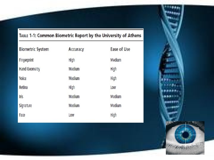 DIFFERENT TYPES OF BIOMETRICS DNA Matching Chemical Biometric The identification of an individual using the analysis of segments from DNA. Ear Visual Biometric The identification of an individual using the shape of the ear. Eyes - Iris Recognition Visual Biometric The use of the features found in the iris to identify an individual. Eyes - Retina Recognition Visual Biometric The use of patterns of veins in the back of the eye to accomplish recognition. Face Recognition Visual Biometric The analysis of facial features or patterns for the authentication or recognition of an individuals identity. Most face recognition systems use local feature analysis.