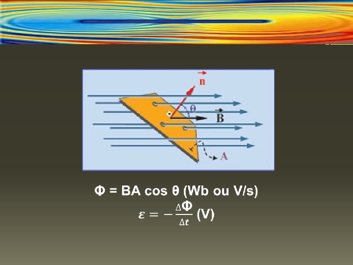 Lei de Faraday § A corrente induzida é diretamente proporcional ao fluxo magnético (Φ) que atravessa o circuito na unidade de tempo. § O fluxo magnético, medida da quantidade de linhas de indução que atravessa uma superfície, é dado pelo produto da área da superfície pelo cosseno do ângulo entre a perpendicular da superfície e o campo magnético.
