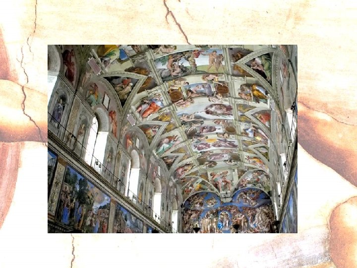 Problems - How do you paint a ceiling 60 feet high? • A scaffold was built that was suspended from the ceiling from ropes. • M saw it and thought it was bad - M knew that when the scaffolding was removed, it would leave holes in the ceiling and ruin the painting. • M came up with solution: flat wooden platform on brackets built out from the wall, high up near the top of the windows. • A series of zigzag ladders allowing getting up and down from the platform. • Lies on back and paints the ceiling.