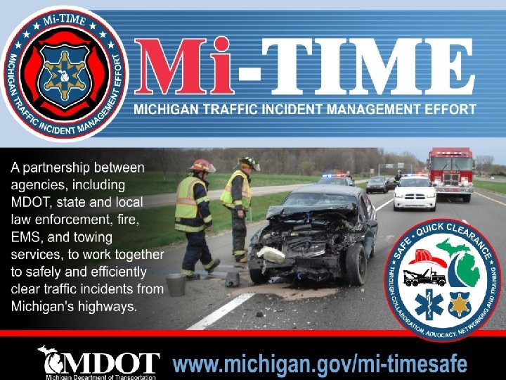 TIM Action Team • Met 20% goal in June 2018: 6, 500 • New goal 50% trained by 12/31/22: 16, 278 • Mi-TIME instructors now total 196 • To date trained 6922 responders • Credits for Mi-TIME training: ü MCOLES ü Professional Engineer CEs ü Fire Q Class ü Dispatch (in progress) ü EMS Blue Book Michigan Traffic Incident Management Effort