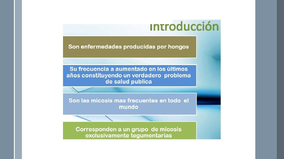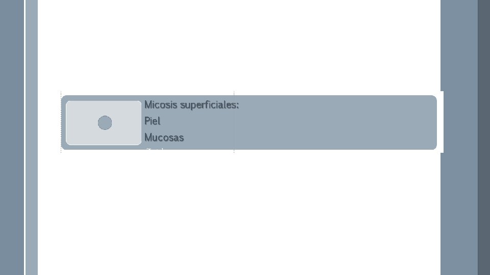 Clasificación Inicial Micosis superficiales: Piel Mucosas Micosis Profundas: Subcutáneas Sistémicas Endémicas Oportunistas