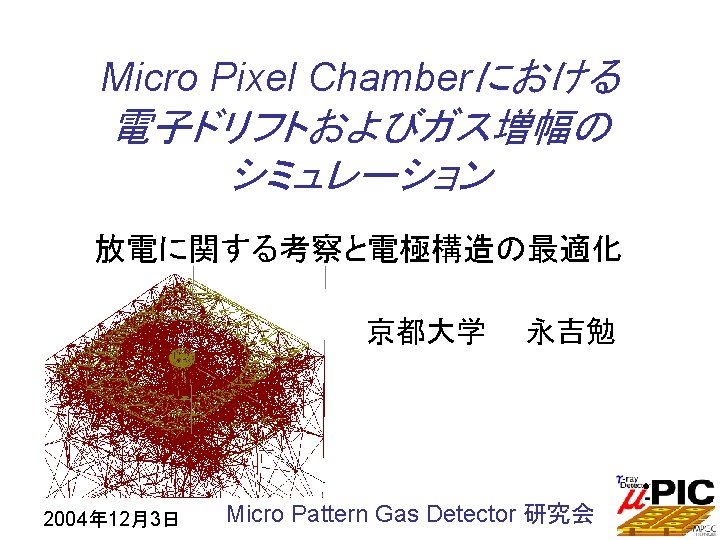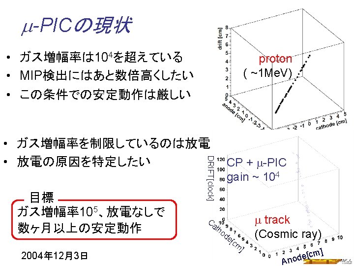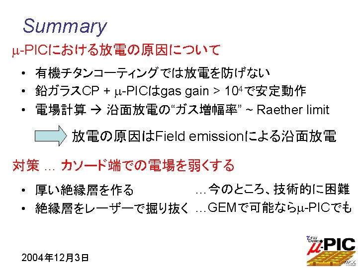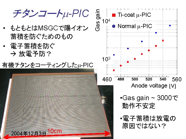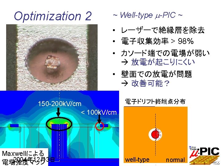 Optimization 1 E field [k. V/cm] 350 Thickness 5 m 100 m 200 m ~ Thick insulator m-PIC ~ Thick insulator High field @ anode Low field @ cathode • High gas gain ( > 105) 100 • Discharge-free operation r O anode (600 V) 2004年 12月3日 cathode (GND)